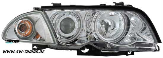 passend für: BMW E46 Limousine / Touring 4Türer (nicht 2Türer und nicht Facelift ). Baujahr: 1998-2001. Ausführung: chrome. Blinker separat (im Lieferumfang enthalten). 2 HIGH LED Standlichtringe (Kristall-Weiss mit HIGH POWER LEDs vergleichbar die Ausleuchtung wie CCFL um ein vielfaches heller als herkömmliche Standlichtringe). elektrische Leuchtweitenregulierung (Motor integriert). Halogenscheinwerfer mit XENON-Optik-Linse. Fernlicht. zu verwendendes Leuchtmittel: H7 Abblendlicht / H7 Fernlicht. mit E-Prüfzeichen / zugel. im Bereich der STVZO . 1 Set bestehend aus 2 Scheinwerfern. Achtung: Nicht für Fahrzeuge mit original Xenon Scheinwerfer.