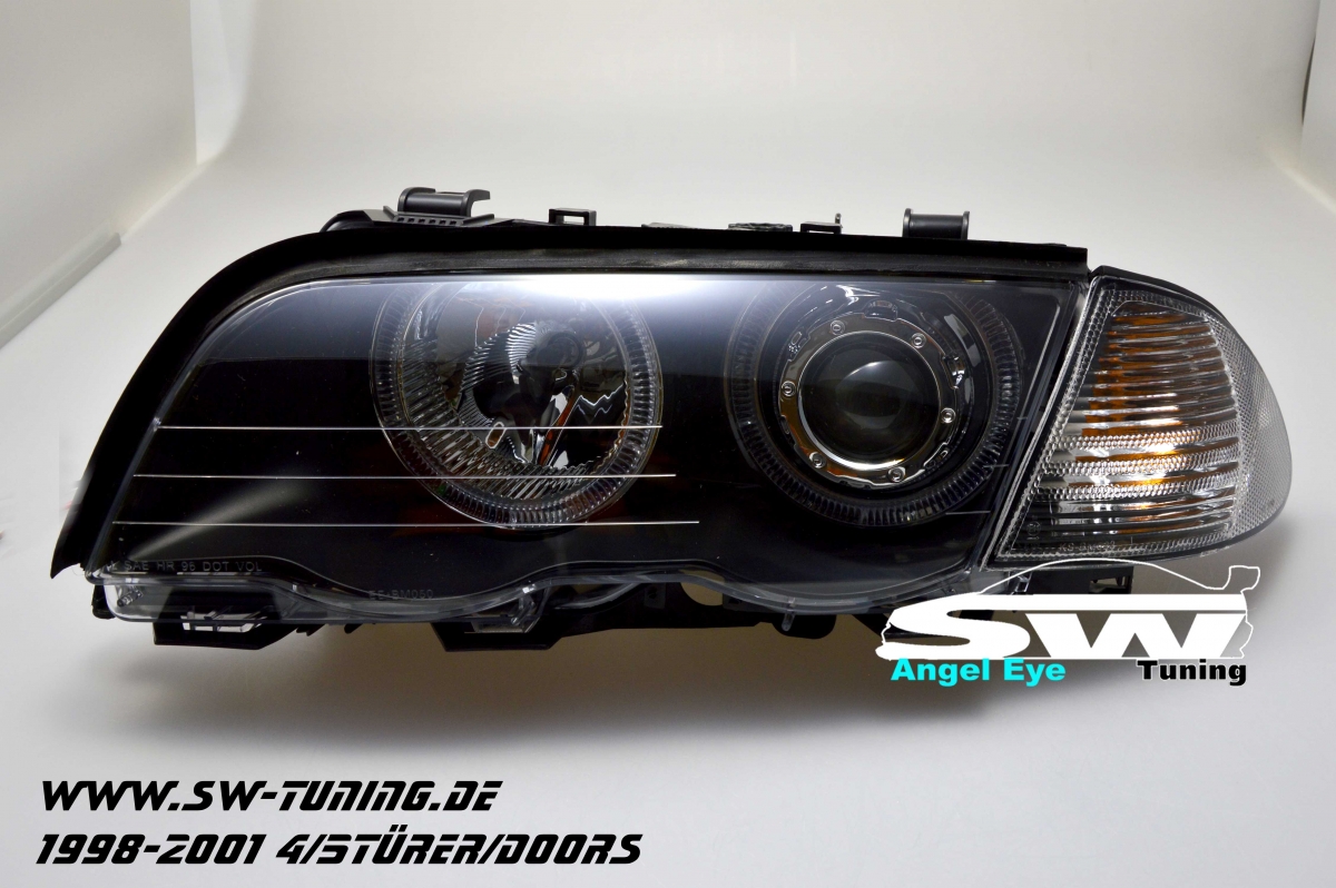 passend für BMW E46 Limousine / Touring (nicht 2Türer) . Baujahr: 1998-2001. Ausführung: Schwarz. Blinker separat (im Lieferumfang enthalten). 2 Standlichtringe Glühbirnen (Lichtfarbe blau/gelblich). elektrische Leuchtweitenregulierung (Motor integriert). Halogenscheinwerfer mit XENON-Optik-Linse. Fernlicht. Leuchtmittel: H1. mit E-Prüfzeichen / zugel. im Bereich der STVZO . 1 Set bestehend aus 2 Scheinwerfern. Achtung: Nicht für Fahrzeuge mit orginal Xenon Scheinwerfer.