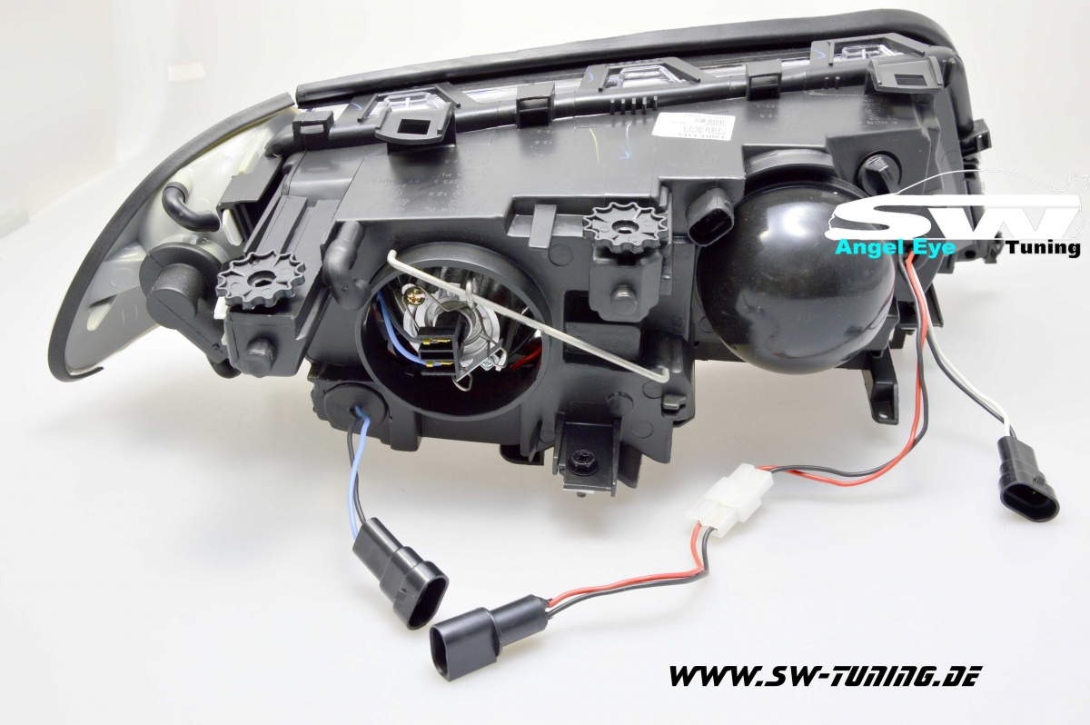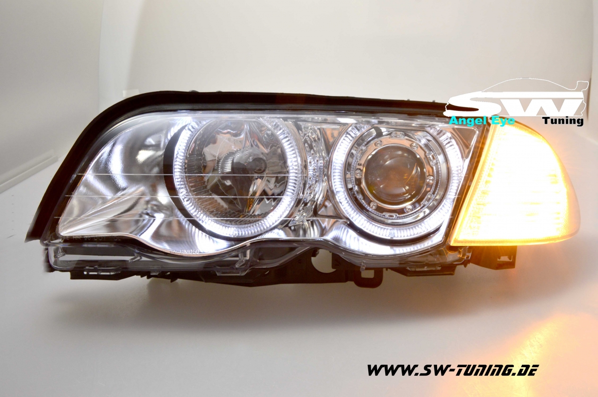 BMW E46 Limousine Touring (nicht 2Türer Cabrio bzw Coupe und Facelift LCI) Baujahr: 1998-2001 Ausführung: chrom Blinker separat (im Lieferumfang enthalten) 2-Standlichtringe mit Blaugelblichen Glühbirnen elektrische Leuchtweitenregulierung (Motor integriert) Halogenscheinwerfer mit XENON-Optik-Linse Fernlicht Leuchtmittel: H7 mit E-Prüfzeichen / zugel. im Bereich der STVZO 1 Set bestehend aus 2 Scheinwerfern Achtung: Nicht für Fahrzeuge mit original Xenon Scheinwerfer