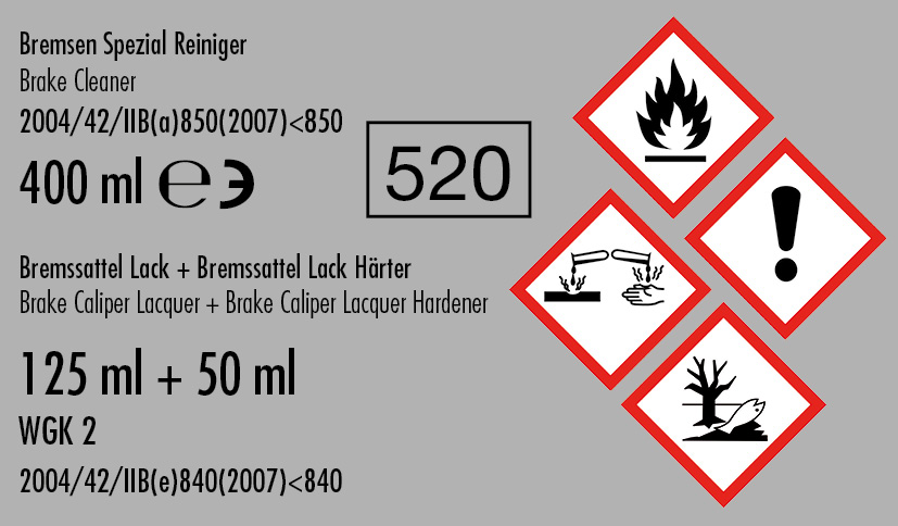 Gefahr: Flüssigkeit und Dampf leicht entzündbar. Verursacht schwere Augenreizung. Kann allergische Hautreaktionen verursachen. Kann Schläfrigkeit und Benommenheit verursachen. Ist ärztlicher Rat erforderlich, Verpackung oder Kennzeichnungsetikett bereithalten. Darf nicht in die Hände von Kindern gelangen. Vor Gebrauch Kennzeichnungsetikett lesen. Von Hitze, heißen Oberflächen, Funken, offenen Flammen und anderen  Zündquellen fernhalten. Nicht rauchen. Explosionsgeschützte elektrische Geräte/Lüftungsanlagen/Beleuchtungsanlagen verwenden. BEI BERÜHRUNG MIT DER HAUT (oder dem Haar): Alle kontaminierten Kleidungsstücke sofort ausziehen. Haut mit Wasser abwaschen/duschen. BEI KONTAKT MIT DEN AUGEN: Einige Minuten lang behutsam mit Wasser spülen. Vorhandene Kontaktlinsen nach Möglichkeit entfernen. Weiter spülen. Unter Verschluss aufbewahren. Entsorgung des Inhalts/des Behälters gemäß den örtlichen/regionalen/nationalen/internationalen Vorschriften. Wiederholter Kontakt kann zu spröder oder rissiger Haut führen. Enthält epoxidhaltige Verbindungen. Kann allergische Reaktionen hervorrufen. Enthält n-Butylacetat, Bisphenol-A-Epichlorhydrinharze mit durchschnittlichem Molekulargewicht 700-1100, Ethylacetat, Xylol.