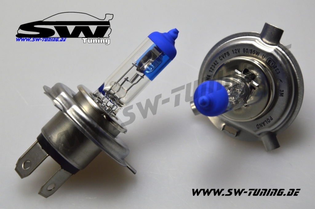 ColorVision Lampen von Philips, mit zusätzlicher Farbnote blau für eine individuelle Optik Ihres Fahrzeuges, haben bis zu 60% mehr Lichtausbeute auf der Straße gegenüber normalen Standard-Halogenleuchtmittel H4 12V 60/55W. Da der Glaskolben speziell mit einem blauen farbbeschichteten Ring versehen ist erzielt man eine Farbige Optik in Ihrem Reflektorscheinwerfer und eine einzigartike Tuning-Optik. Aber auch durch verbesserte Geometrie des Lichtstrahls der Birne, besitzt die Birne eine bessere Ausleuchtung bei Nacht, durch ein weisseres Licht gegenüber Standart-Halogen H4 Lampen. Keine Fern-Ost Ware. Zertifkationskarte liegt der sendung bei