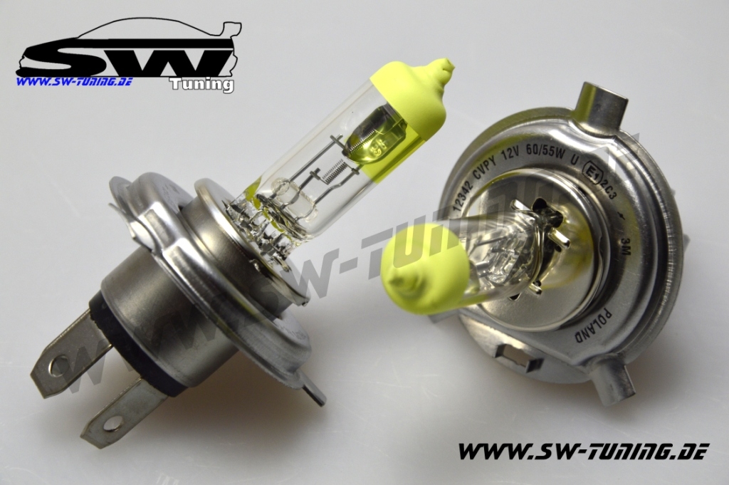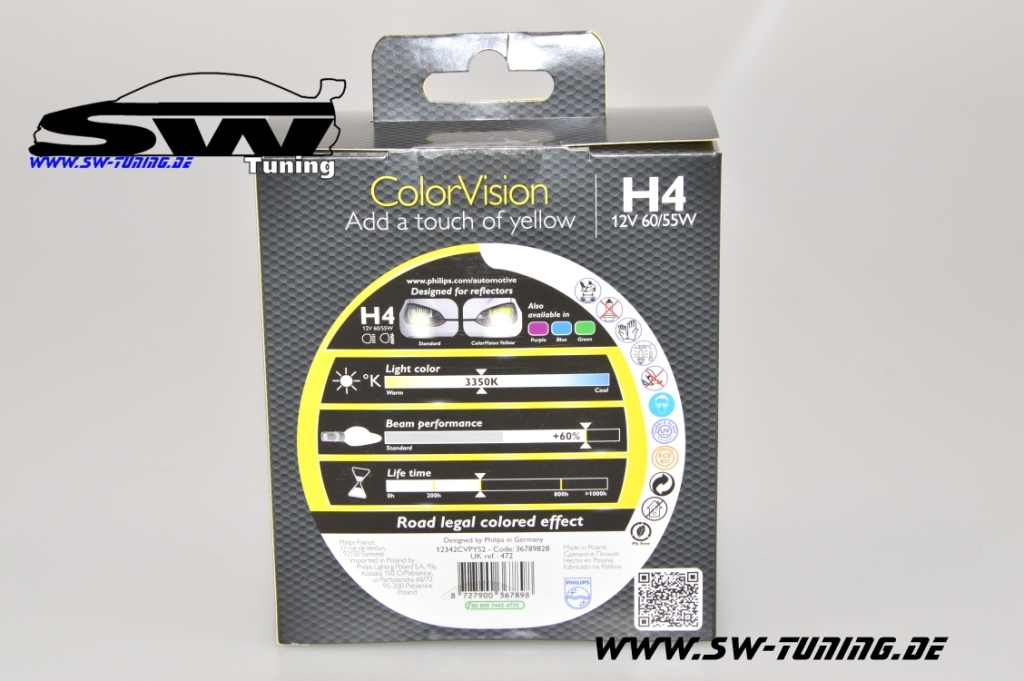 ColorVision Lampen von Philips, mit zusätzlicher Farbnote gelb für eine individuelle Optik Ihres Fahrzeuges, haben bis zu 60% mehr Lichtausbeute auf der Straße gegenüber normalen Standard-Halogenleuchtmittel H4 12V 60/55W. Da der Glaskolben speziell mit einem gelben farbbeschichteten Ring versehen ist erzielt man eine Farbige Optik in Ihrem Reflektorscheinwerfer und eine einzigartike Tuning-Optik. Aber auch durch verbesserte Geometrie des Lichtstrahls der Birne, besitzt die Birne eine bessere Ausleuchtung bei Nacht, durch ein weisseres Licht gegenüber Standart-Halogen H4 Lampen. Keine Fern-Ost Ware. Zertifkationskarte liegt der sendung bei