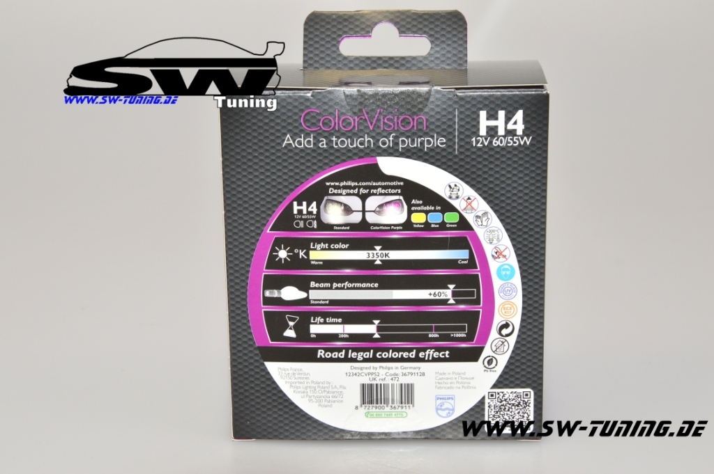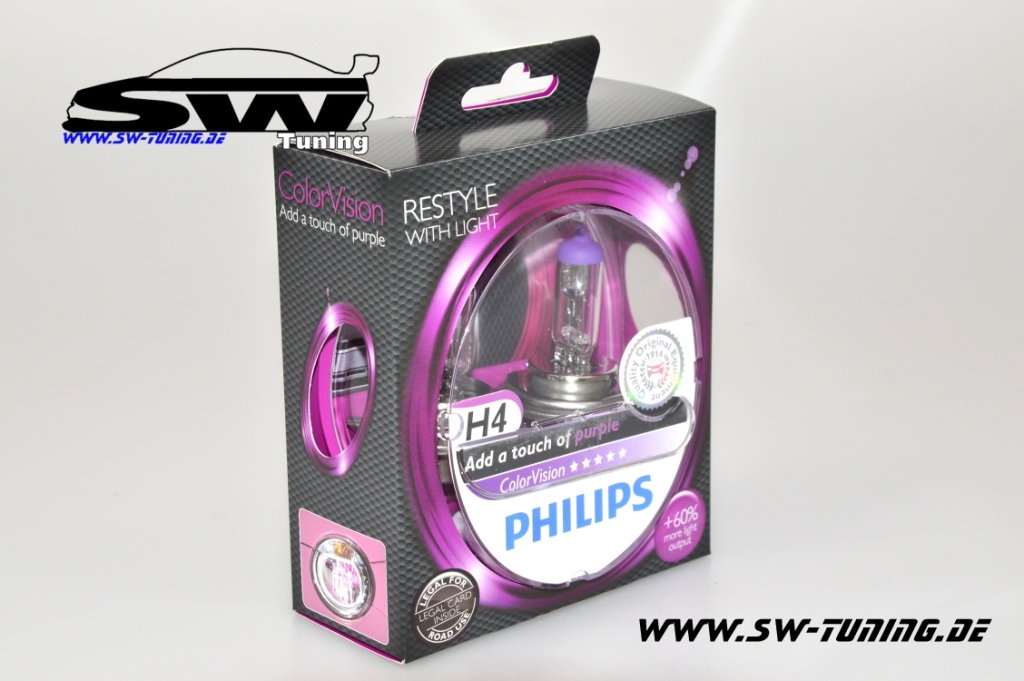 ColorVision Lampen von Philips, mit zusätzlicher Farbnote pink für eine individuelle Optik Ihres Fahrzeuges, haben bis zu 60% mehr Lichtausbeute auf der Straße gegenüber normalen Standard-Halogenleuchtmittel H4 12V 60/55W. Da der Glaskolben speziell mit einem pink farbbeschichteten Ring versehen ist erzielt man eine Farbige Optik in Ihrem Reflektorscheinwerfer und eine einzigartike Tuning-Optik. Aber auch durch verbesserte Geometrie des Lichtstrahls der Birne, besitzt die Birne eine bessere Ausleuchtung bei Nacht, durch ein weisseres Licht gegenüber Standart-Halogen H4 Lampen. Keine Fern-Ost Ware. Zertifkationskarte liegt der sendung bei