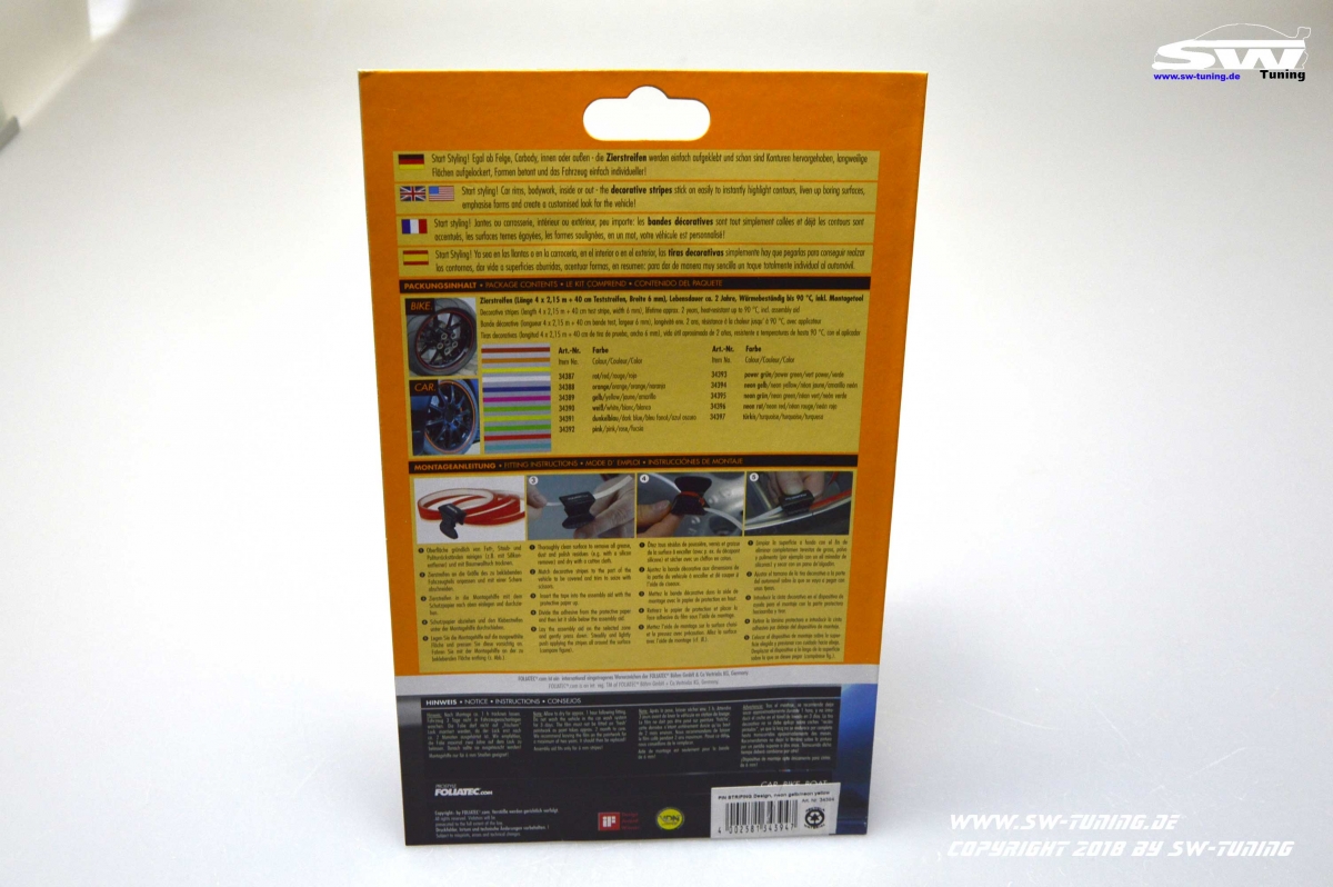 Die Foliatec Pin-Stiping Folie ist ideal für Felgen geeignet, da hierfür ein spezieles Felgen-Montagewerkzeug dem Set beiliegend ist. Aber auch für die Karosserie sind diese Zierstreifen Folien geeignet und kann zur Verzierung und Hervorhebung von Konturen verwendet werden.