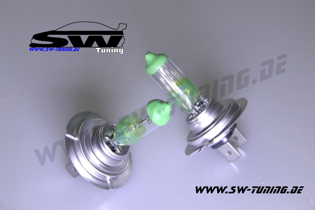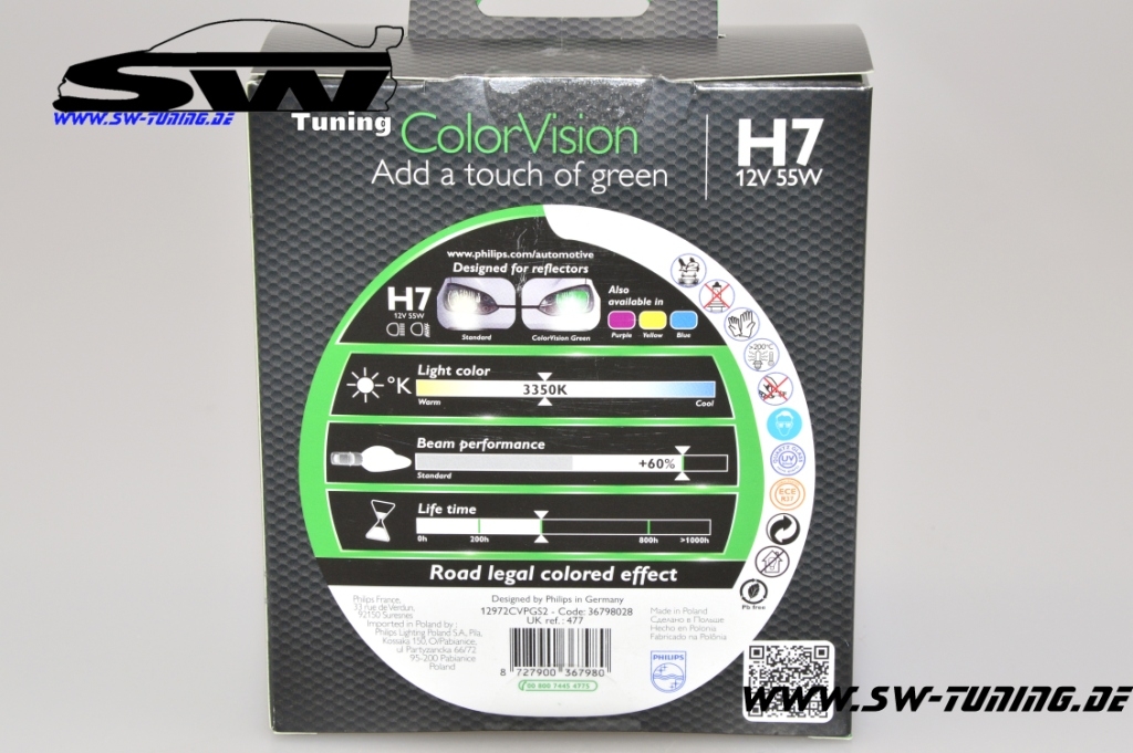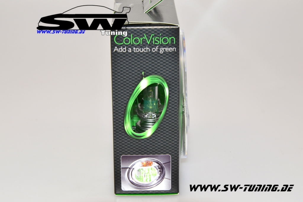 Color-Vision Birnen von Philips haben bis zu 60% mehr Lichtausbeute auf der Straße gegenüber normalen Standard-Halogenleuchtmittel-12V/55W H7 mit zusätzlicher Farbnote grün für eine individuelle Optik Ihres Fahrzeuges. Da der Glaskolben speziell mit einem grünen farbbeschichteten Ring versehen ist erzielt man eine farbige Reflektion in Ihrem Reflektorscheinwerfer. Aber auch durch verbesserte Lichttechnik/Geometrie der Birne besitzt die Birne eine bessere Ausleuchtung bei Nacht, durch ein weisseres Licht gegenüber Standart-Halogen H7 Lampen. Keine Fern-Ost Ware. Zertifkationskarte liegt der Sendung bei.
