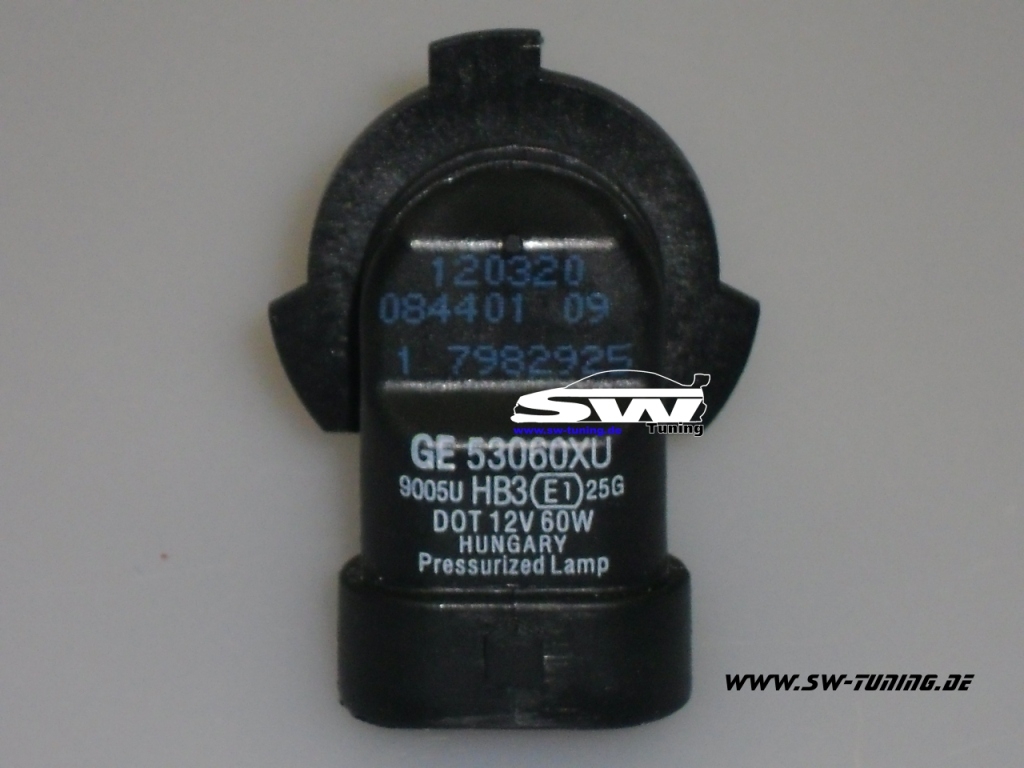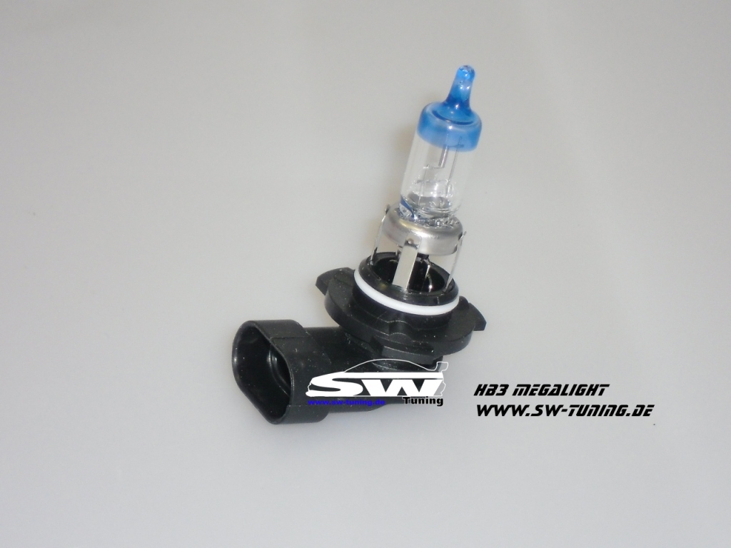 GE (General Electric) Megalight Ultra Lampen bis zu 90% mehr Lichtausbeute auf der Straße gegenüber normalen Standard-Halogenleuchtmittel-12V/60W HB3. Da der Glaskolben speziell mit einem blauen Ring farbbeschichtet ist erzielt man eine bessere Ausleuchtung bei Nacht, durch ein weisseres Licht gegen Standart-Halogen HB3 Lampen.