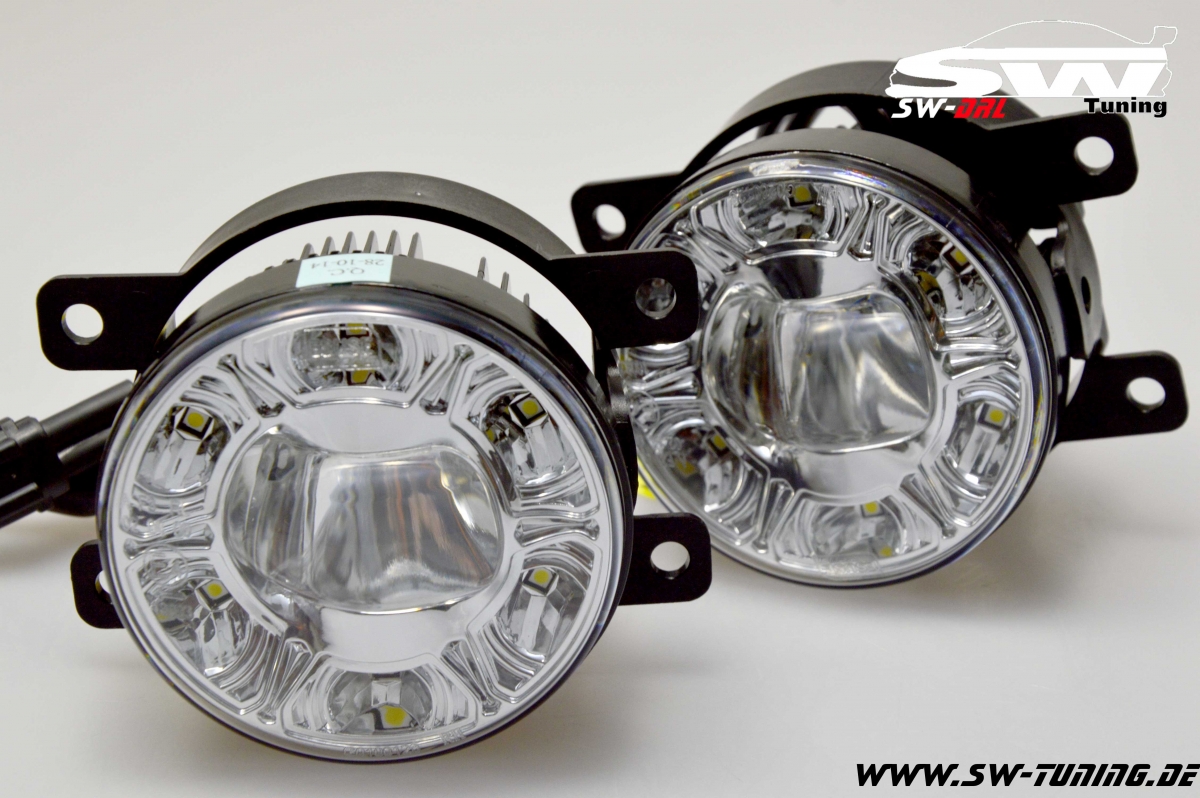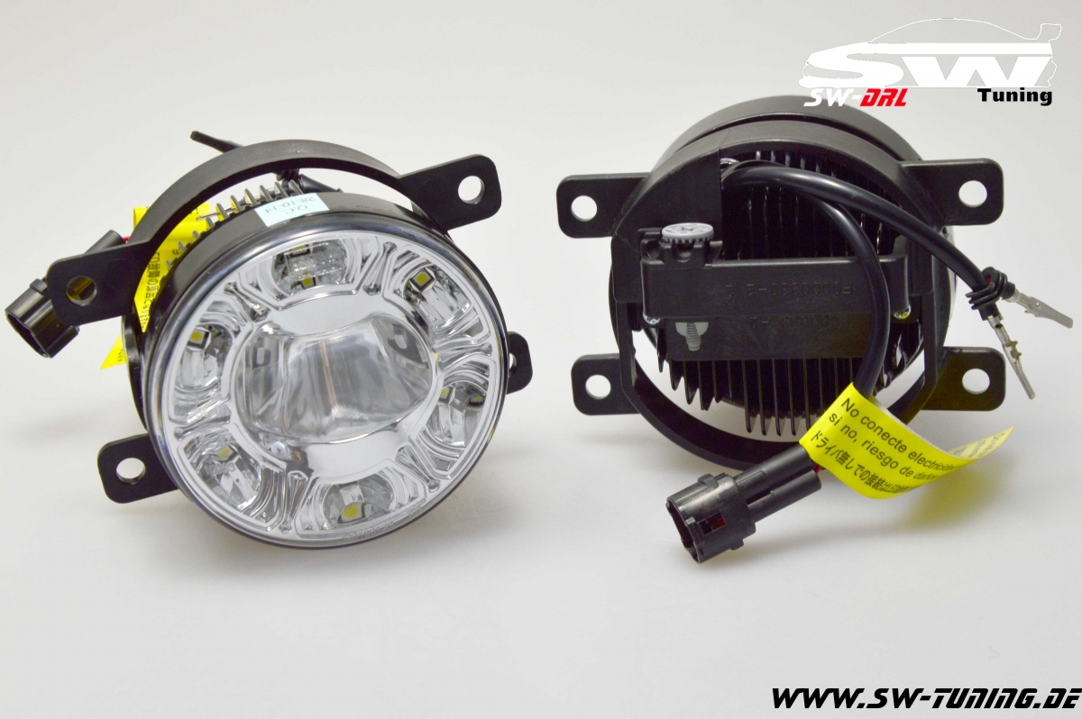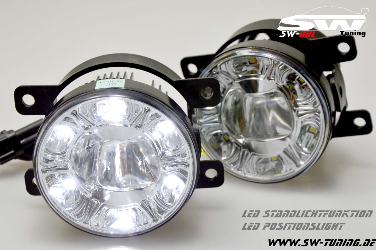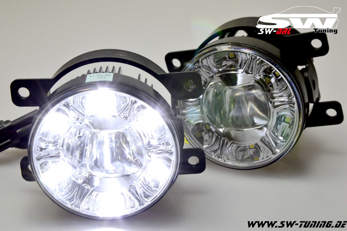 LED Tagfahrlicht mit LED Nebelscheinwerfer sowie LED Standlicht und DE-Linse für Suzuki, Renault, Opel, Ford, Porsche, Peugeot, Nissan, Citroen und Dacia.