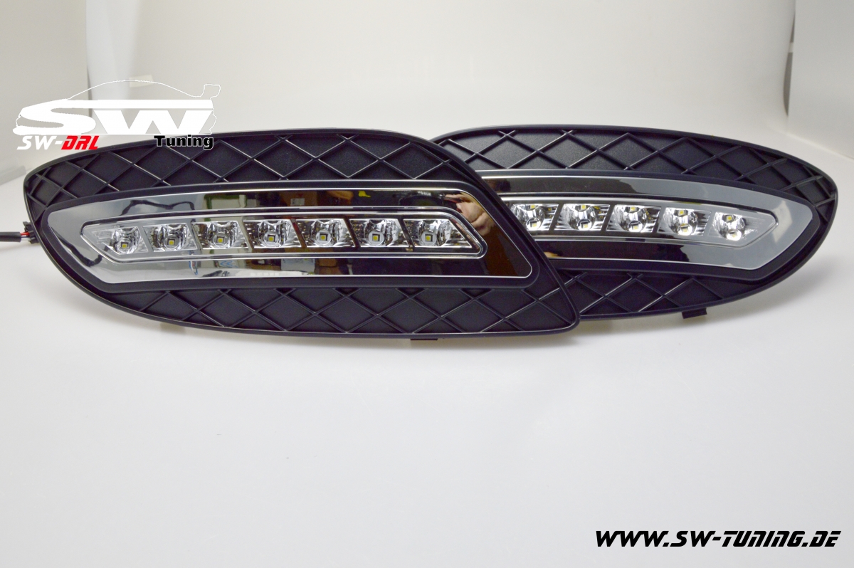 LED Tagfahrlicht für Mercedes Viano W639 Facelift 2011-2013 chrome mit schwarzem Gitter zum Nachrüsten.