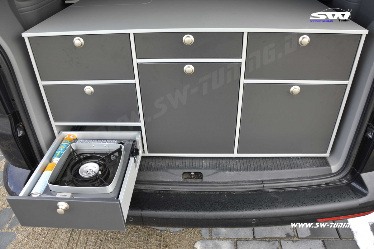 Diese qualitative Hochwertige Heckküche ist in Minuten Ein.- und Ausbaubar ideal für spontanen Nutzung des herkömmlichen alltags Fahrzeugs als Camper. Die Heckküche bietet verschiedene Schubfächer und verstauungsmöglichkeiten für einen Reise oder Kurztripp.