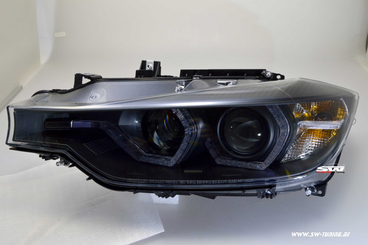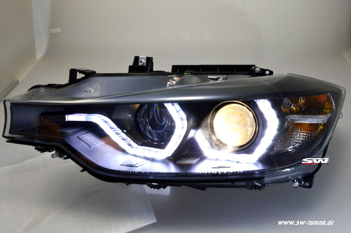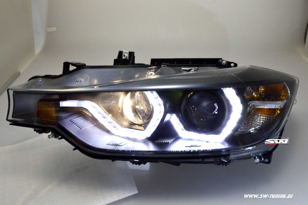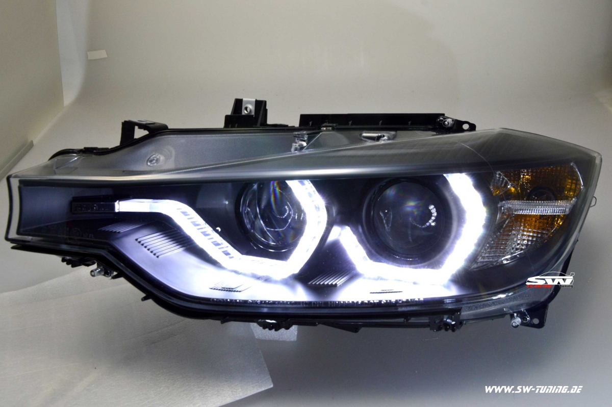 SW-DRL Angel Eye Scheinwerfer für 3er BMW F30 / F31 2012-2015 black mit U-Tube LED Standlicht und LED Tagfahrlicht R87.