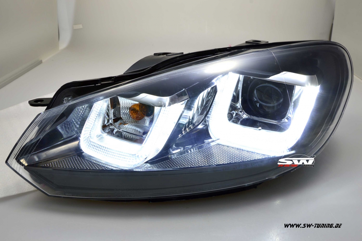 SW-DRLtube Scheinwerfer für VW Golf 6 08-12 black mit LED Tagfahrlicht-Lighttube R87 Black-Line in G7-Look