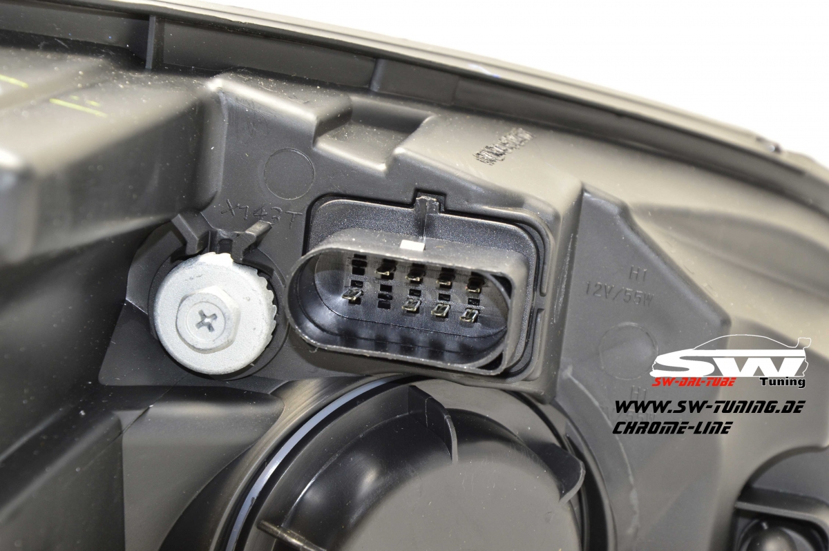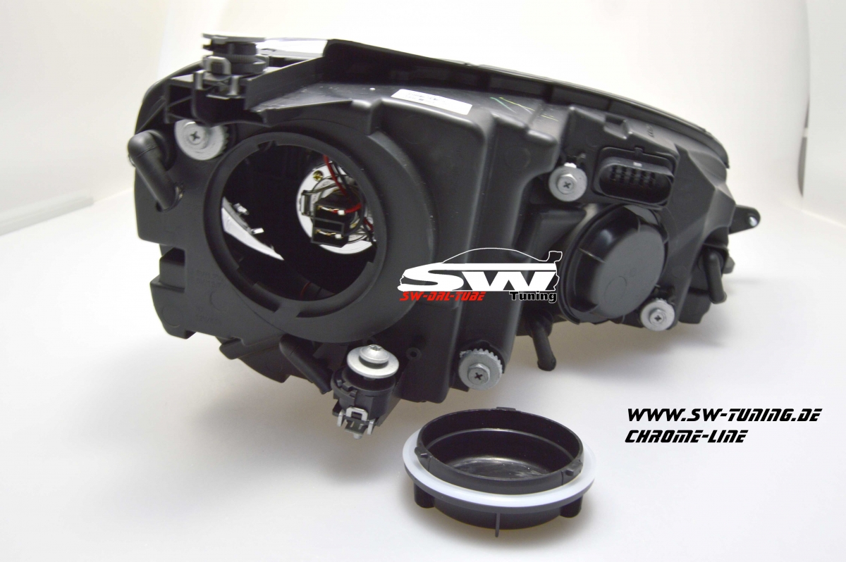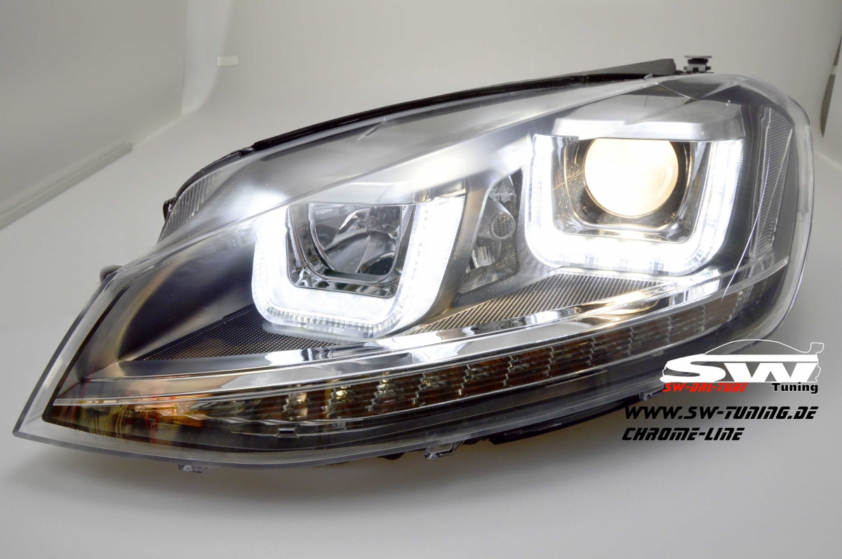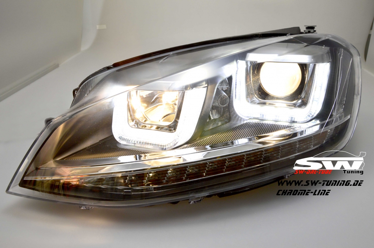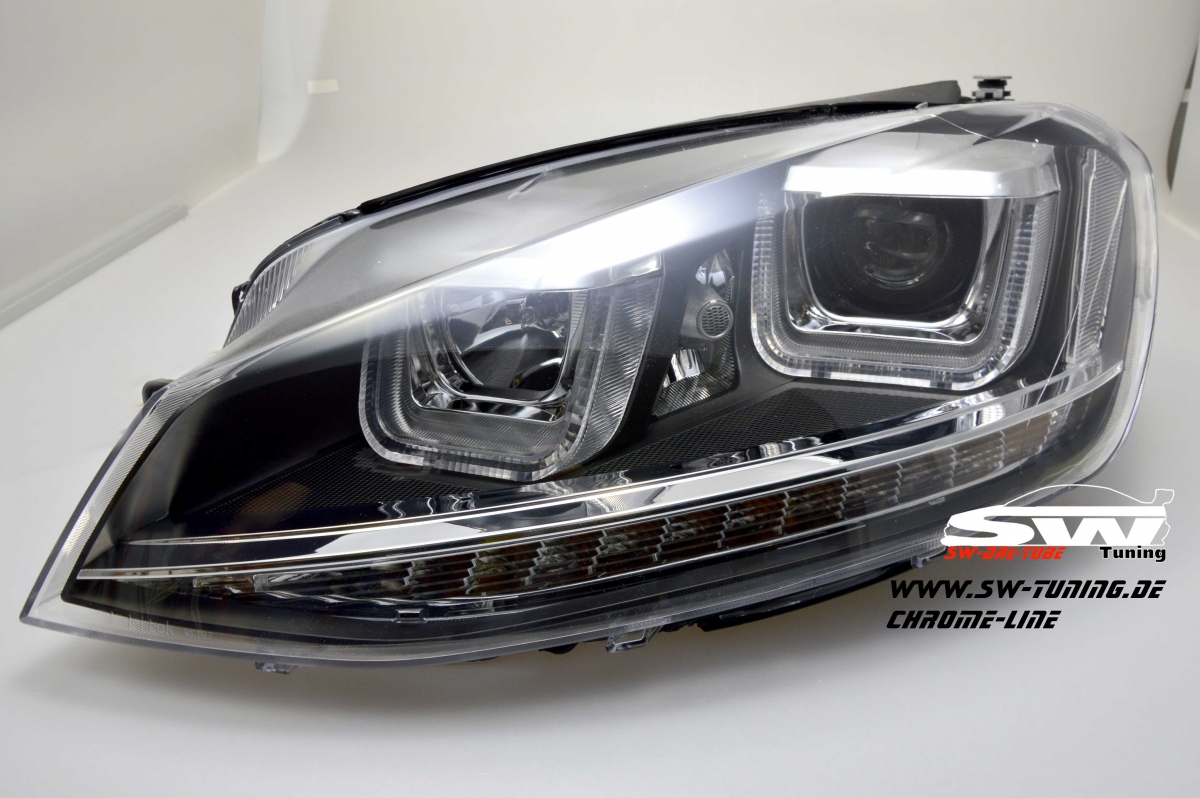 SW-DRLtube Scheinwerfer VW Golf 7 2012-2015 black mit 3D LED U-Tagfahrlicht-Lighttube R87 im R-Look Chrom-Line.