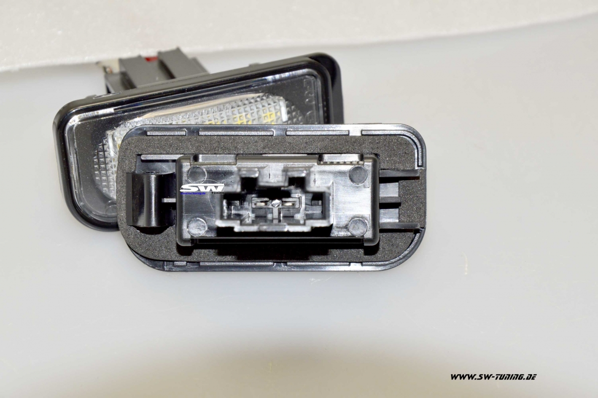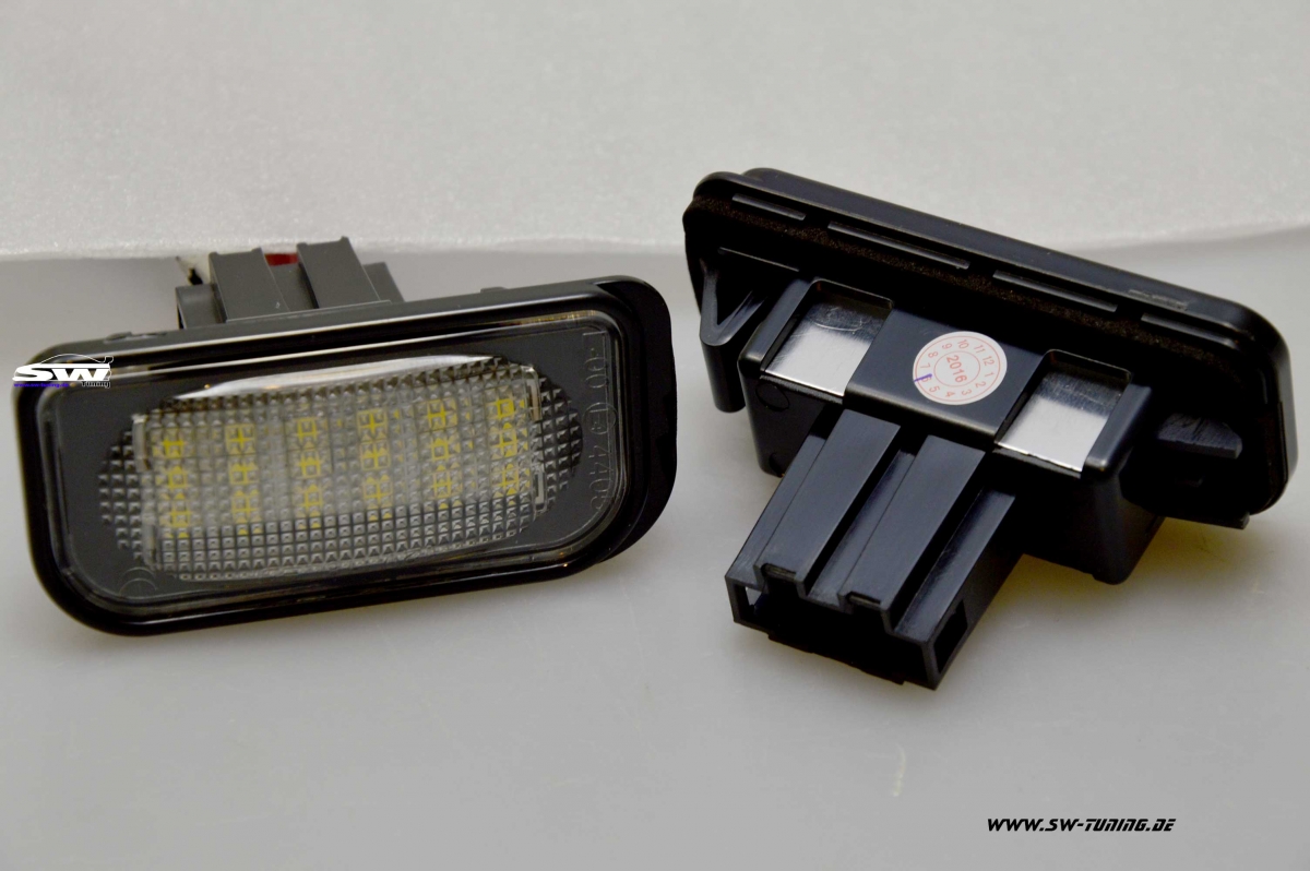 The car-specific solution for the perfect plate illumination with LED compatible with Mercedes Benz models: W203 Limousine 2000-2007 and CL203 Coupe 2000-2008 and CLK W209 A209 2002-2010 compatible with boardcomputer compatible with original connector / no need for alterations 18 LED per unit 1 Set includes 2 pieces