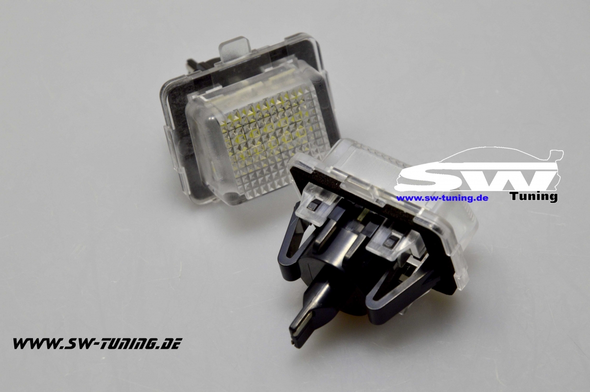 The car-specific solution for the perfect plate illumination with LED .compatible with Mercedes Benz .models: W204 Limousine, W204 T-Modell, W221, W212 .compatible with boardcomputer .compatible with original connector / no need for alterations .18 LED per unit .1 Set includes 2 pieces The dectane LED license plate illumination provides a vehicle-specific solution for high-power illumination of the plate. These items are perfectly matching to each vehicle and are plug-and-play. It is not in the illumination of a LED Festoon, but an elaborate crafted LED board with the maximum number of LEDs. This solution enables a uniform and bright illumination of the plate, which will light up after the installation in a pure LED white.