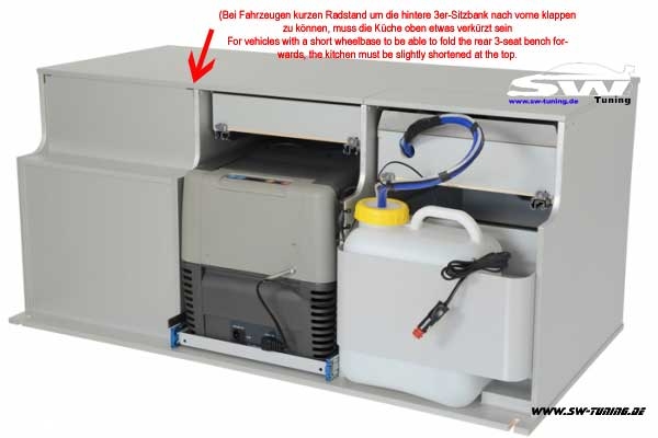 • (For vehicles with a short wheelbase to be able to fold the rear 3-seat bench forwards, the kitchen must be slightly shorter at the top (height 56/50cm). If no 3rd row of seats is installed or used for the journey, this offset is not necessary (see pictures).