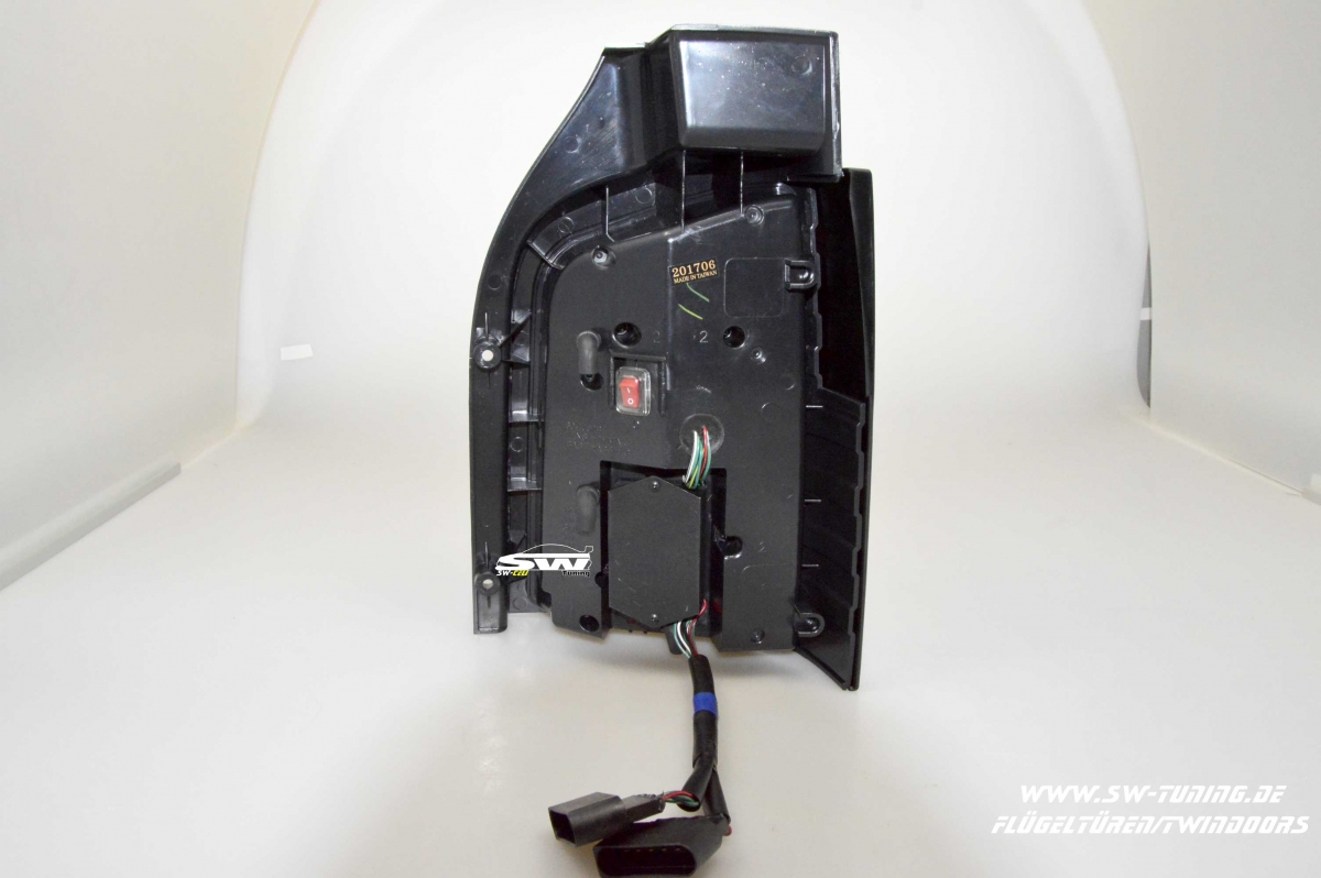 LED parking light / tail light guide technology RED-Lightbar Design ( red housing the Lightbar) LED brake light LED indicators with optional dynamic turn signal. Switchable with switch.(Dynamic function dependent on the flashing frequency) LED Reversing lights (only right side) LED Rear fog light (only left side) with E-mark / allowed on public roads 1 set consisting of 2 tail lights