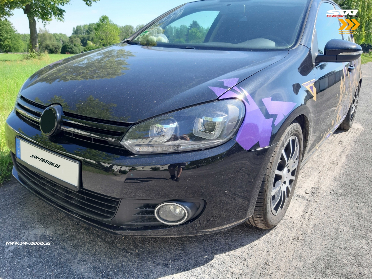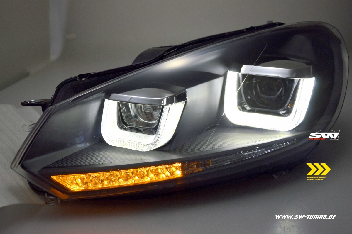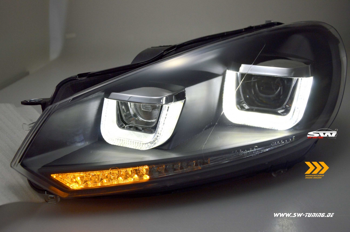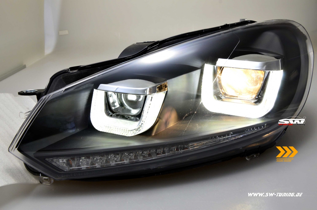 SW DRLtube headlights for VW Golf VI 08-12 black with LED daytime running light R87 LightTube with LED dynamic indicator. compatible with VW Golf VI Type 1K Year: 2008-2013. Color: black . LED daytime running light with R87 approval in light control LightTube (real DRL). integrated dynamic LED indicator. Integrated motor for electric headlight adjustment. Halogenheadlights with HID look lens low beam and High-beam HB3. with E-mark / street for street. 1 set consisting of 2 headlights. Warning: Not for cars with xenon headlights.