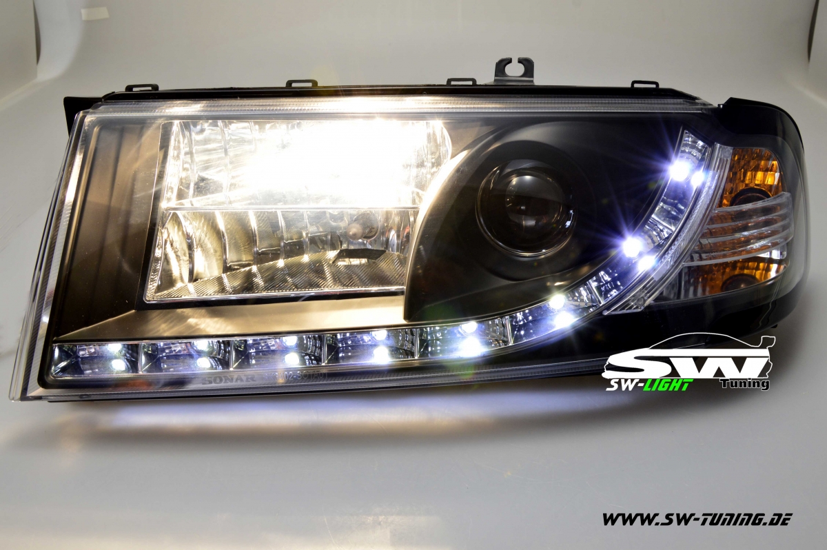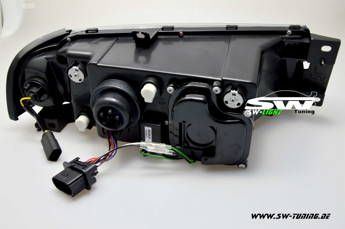 Oneblock-Design, integrated indicator. LED-Position light (no DRL). prepared for electric highness control (Using original motors). HID look lens. High beam. Fog light. Lighting: H1. E Mark. Set includes 2 headlights.