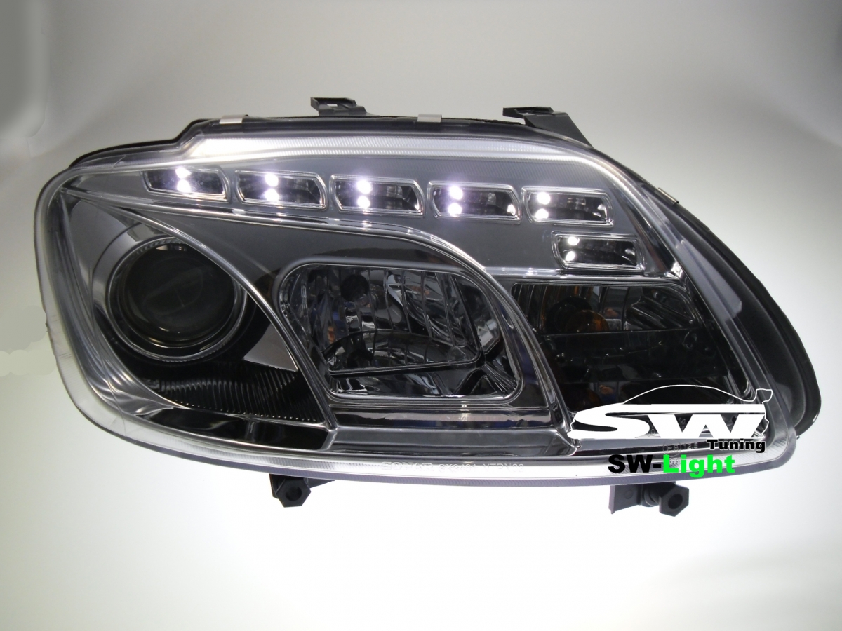 SW-light headlights VW Touran 1T / Caddy 03-06 led positionslight chrome VW Touran 1T / Caddy Toruan Year: 2003-2006 (non-facelift model!) Caddy Year: 2003-2010 Finish: chrome Oneblock design, integrated indicator LED-Position light (not real DRL) prepared for electric headlight adjustment HID look lens beam Bulb: H7 / H1 E-Approved / Permitted in for STVZO