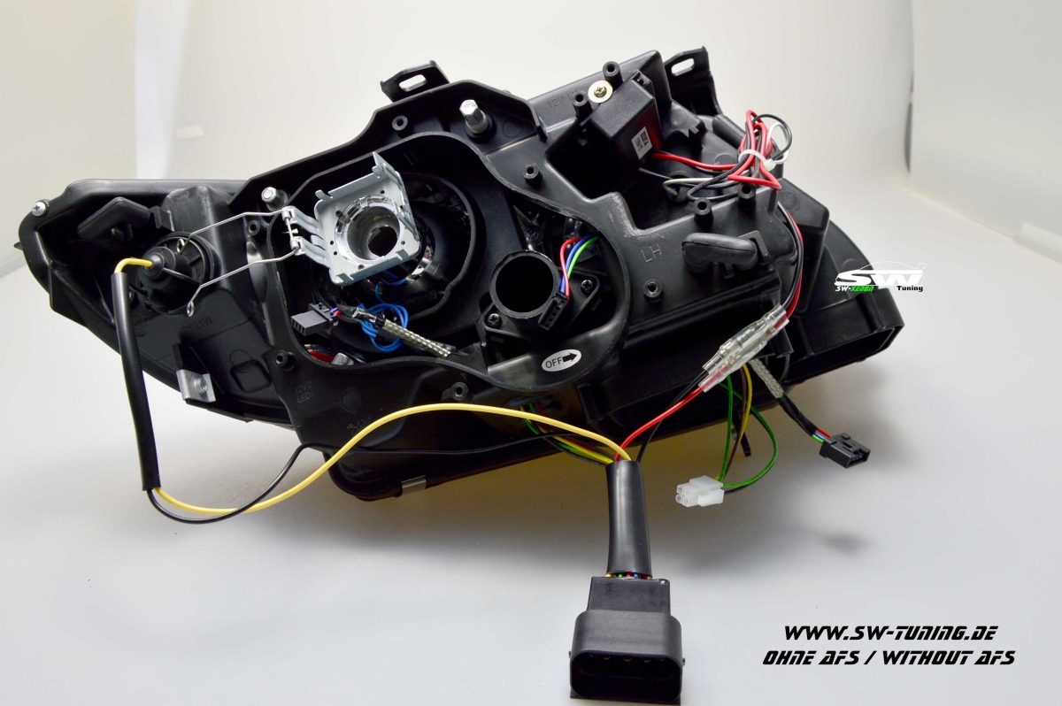 Oneblock-Design, integrated indicator. 2 HIGH U-LED Halo rims 3D (crystal clear white) (no DRL). prepared for electric highness control. BI-Xenonheadlights with HID lens. WITHOUT AFS! Lighting: D1s low beam / high beam . Ballast and lamp not included in scope of delivery. E Mark. Set includes 2 headlights. attention: not for right hand drive! Warning: not for cars with halogen headlights .