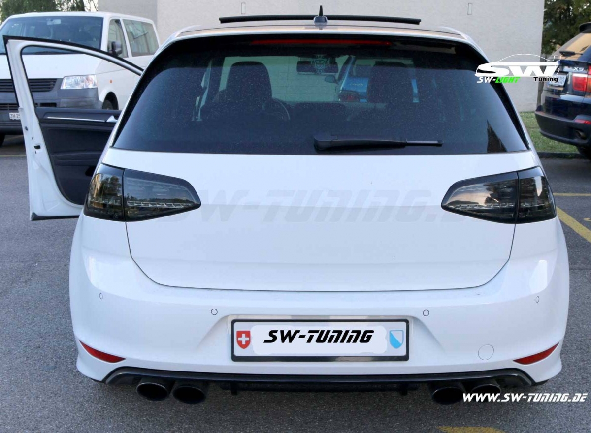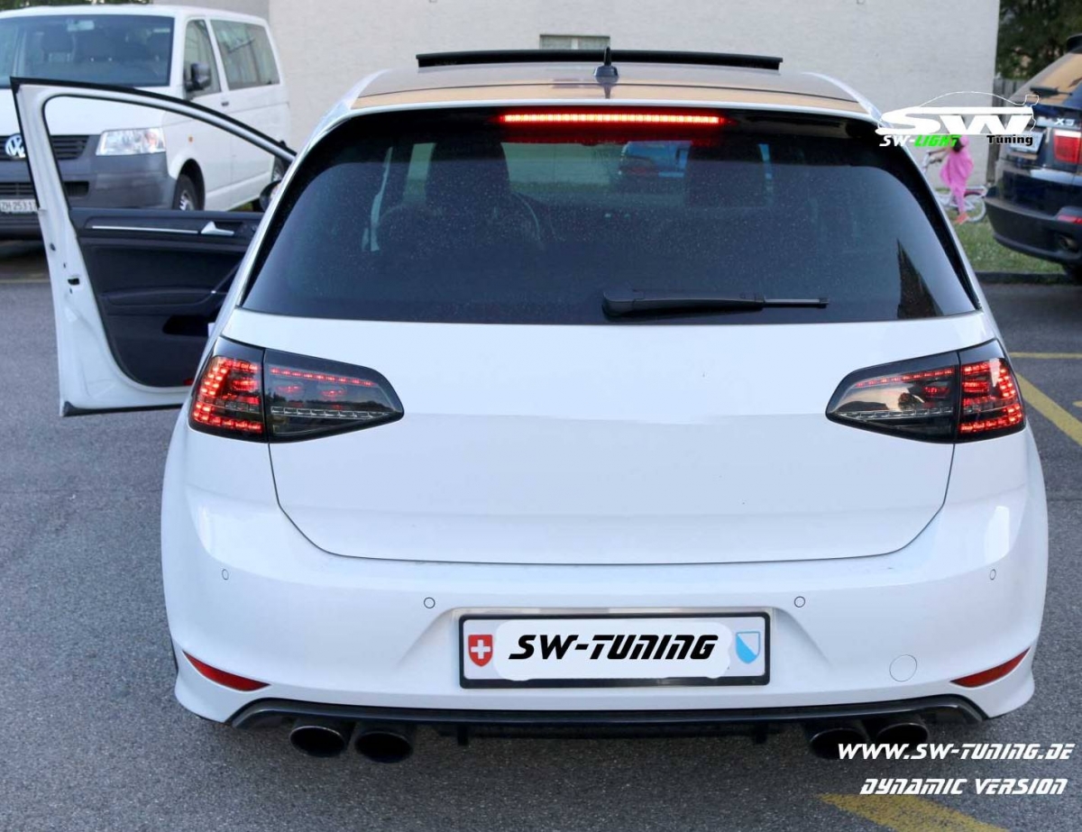 SW Light LED taillights VW Golf 7 AU Limousine 08-12 black /smoke. compatible for: VW Golf VII Type AU (not stationwagon/variant). Year: 12/2012-2016. Color: black/smoke . FOR CARS WITH SERIES LED Taillights !! and suitable for vehicles with standard blub taillights!! optional choose. LED parking light . LED brake light (depending on the vehicle encoding the tailgate portion lights as stop lamp with!). LED indicators static or optional dynamic turn signal (see selection) (with dynamic version are 2 LEDs of the parking light which go through the turn signal disabled).