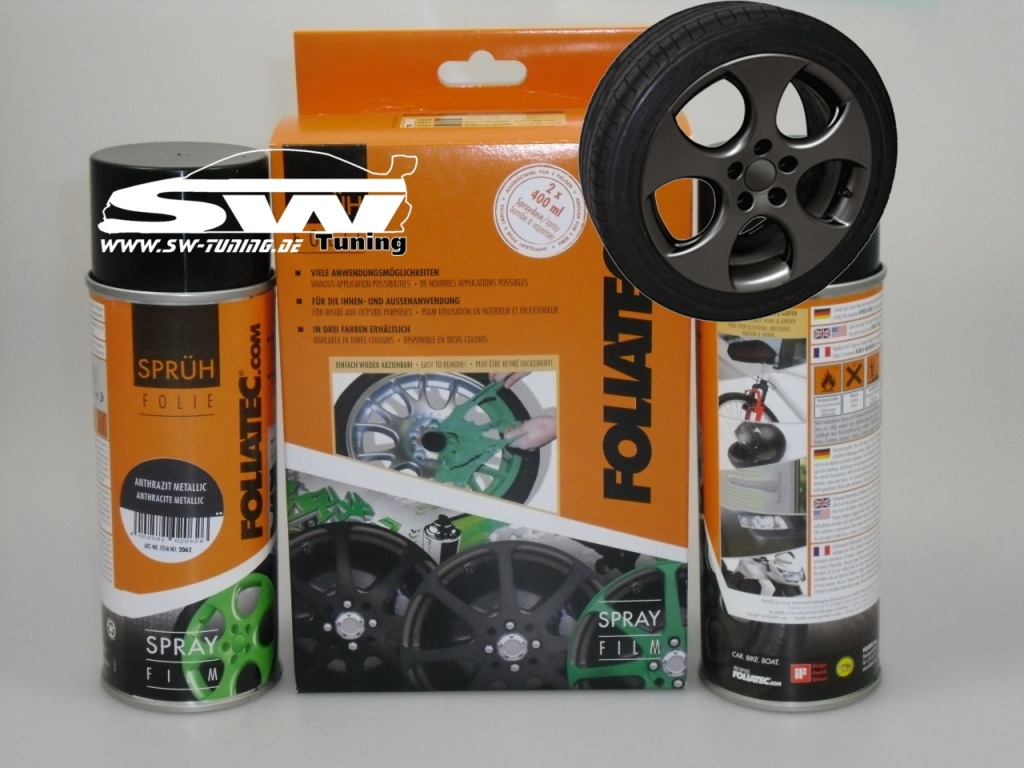 Foliatec Wheels foil-yourself spray. anthracite metallic The film is easy to apply spray on the wheels and can also be easily removed again. Individualisiern your rims, your miss in the new colors. You should look like no more after some time, just drag the slide again and can then spray another color (lying in fashion) Frabe /. This Sprühfolie can apply not only on Wheels but also be applied to other surfaces such as bumpers, mirrors, etc. The creative core can thus be allowed to freewheel. properties: Used both indoors and outdoors e.g. Wheels, bumper, etc peelable waterproof General. Processing information: The application should be done in a Clean and well-ventilated area The best processing temperature between 15-25 Celsius Crad Wheels should be cleaned for a good result smooth and thoroughly Care instructions: When cleaning in a car wash with brush or a pressure washer, it can lead to detachment of the film. In a preliminary test cleaner on an inconspicuous area on the film. Phased points simply by Sprühfolie mend zuverhindern further detachment. Regular cleaning. Scope of supply: 2x400ml in color anthracite metallic