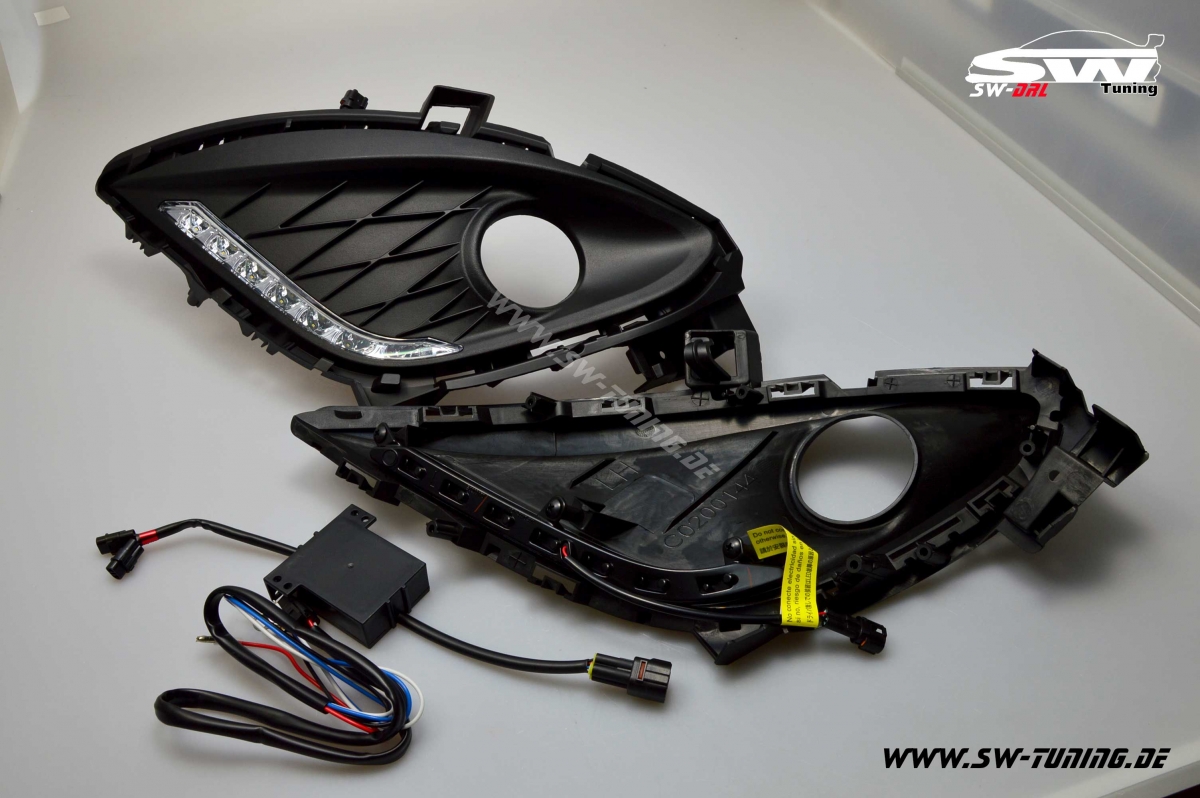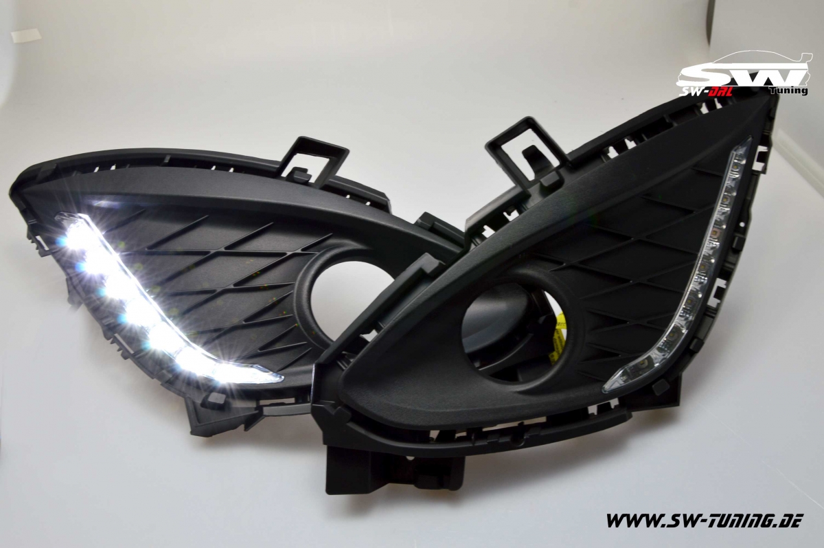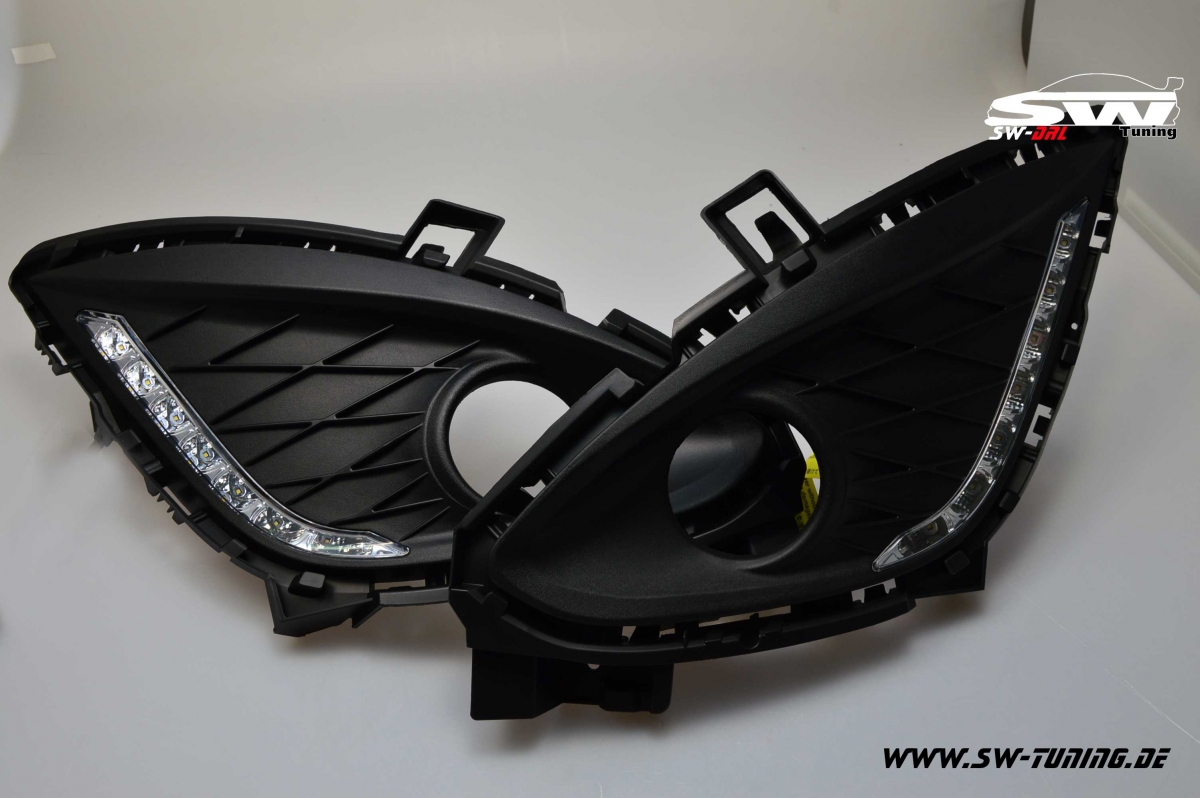 LED daytime running lights for Mazda 5 CW 2010-2013 chrome with black grid for retrofitting. a perfect fit and vehicle-specific daytime running lights integrated air inlet grill